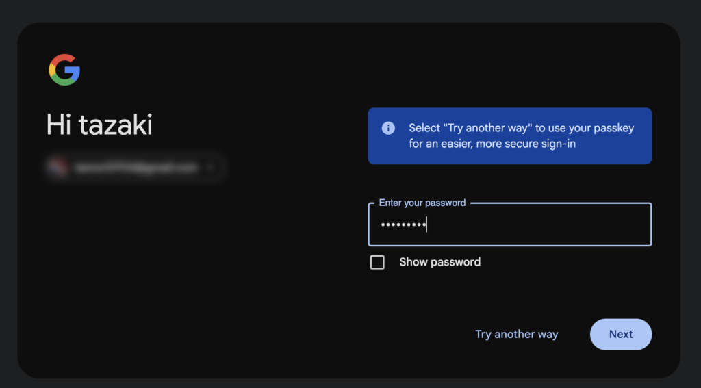 通常のアカウント認証と同じく、パスワードを入力してログインの手続きを進めます。