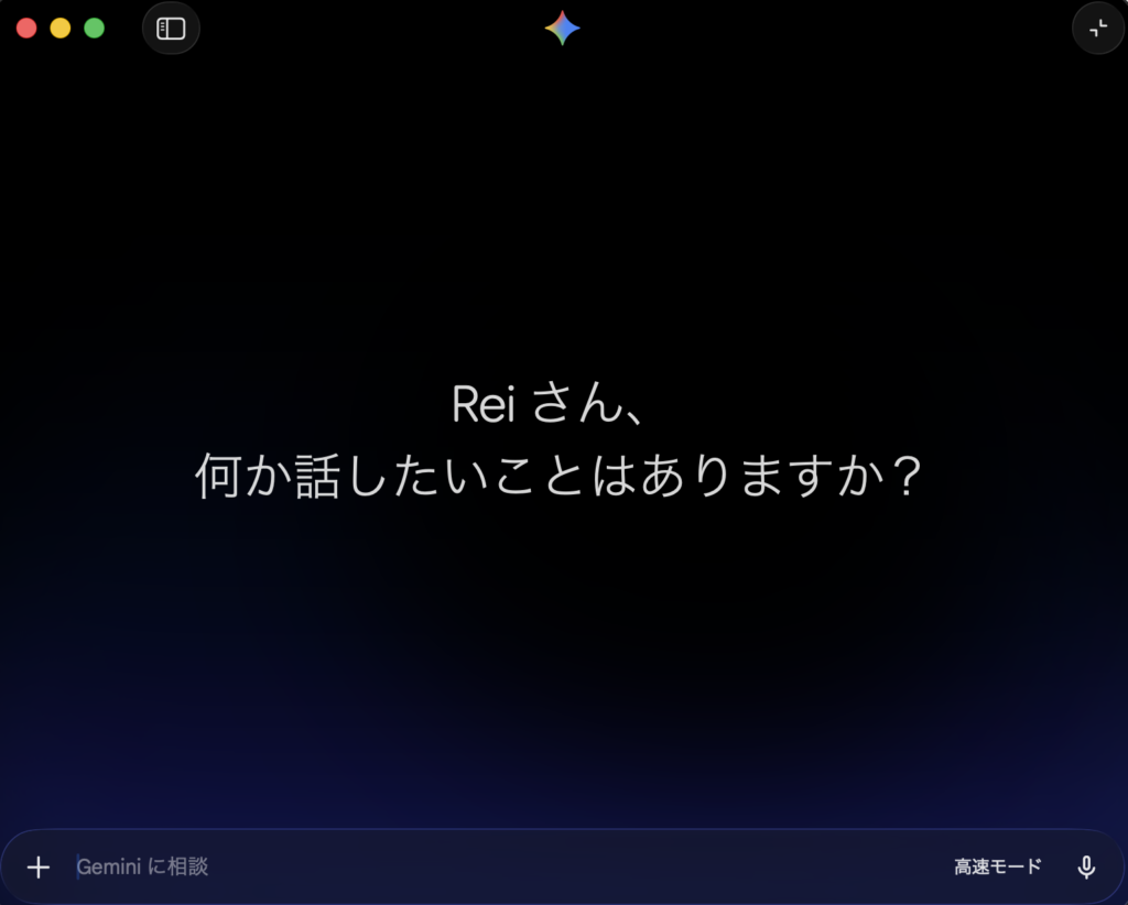 さらに「Option + Shift + Space」のショートカットキーを利用すると、フルチャットでGeminiを開くことができます。これらのショートカットは設定で変更可能です。メニューバーやDockからも起動できますが、ショートカット中心の使い方が最も快適です。