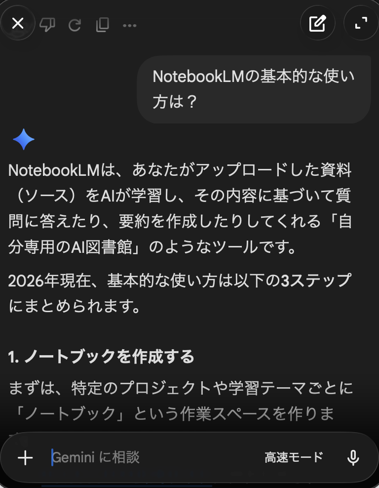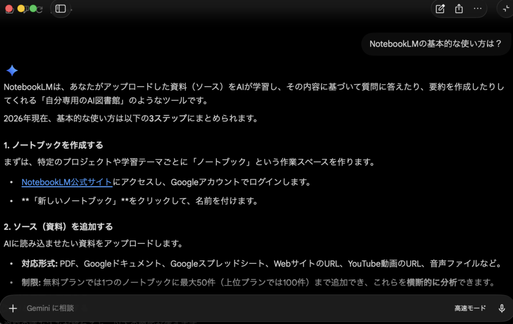 この「すぐ呼び出せる」感覚は、ブラウザ版とはかなり違います。たとえば記事を書いている途中に言い回しを整えたいとき、スプレッドシートで関数を確認したいとき、ちょっとした要約を頼みたいときなどに、アプリを一瞬だけ開いて質問し、終わったらすぐ元の作業へ戻れます。Googleも公式に「ウィンドウ切り替えを減らし、作業フローを保ちやすい」点をMac版の強みとして挙げています。
