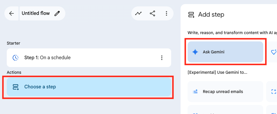 次にActionsの設定を行います。「Choose a step」をクリックし、「Ask Gemini」を選択します。