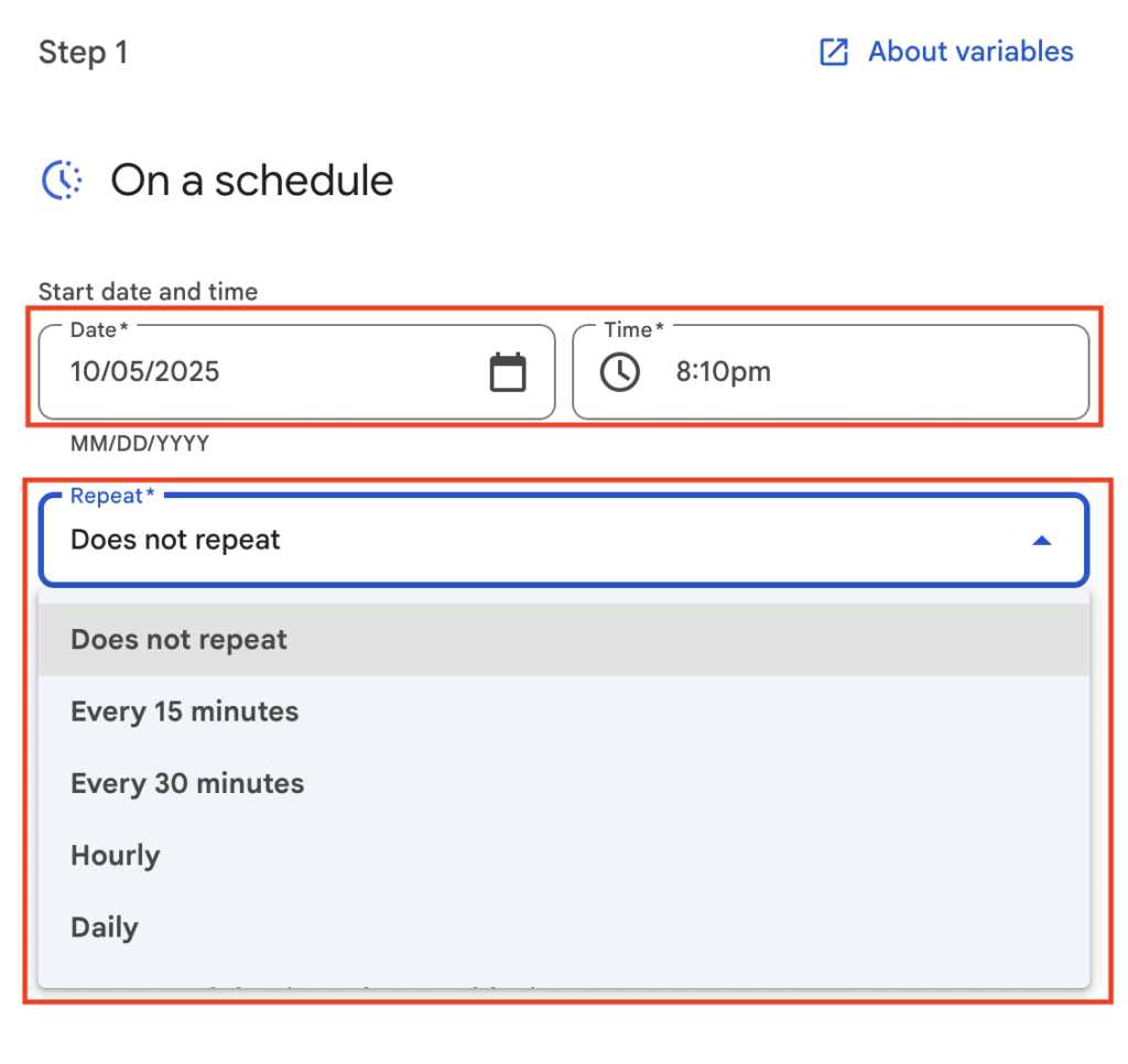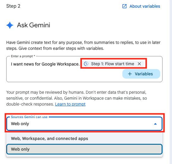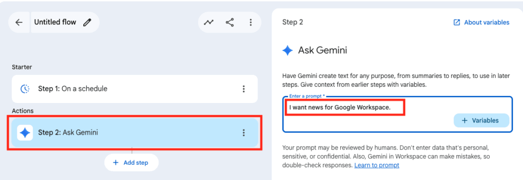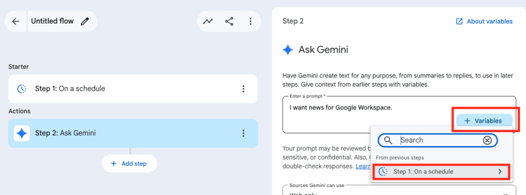 プロンプトを入力したら「+ Variables」をクリックし、Step1で設定したスケジュール設定を指定します。これで、指定日時と頻度をトリガーとして、Step2の「Ask Gemini」を起動することができます。