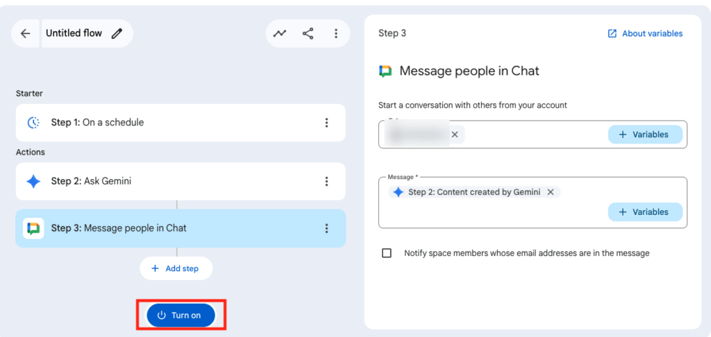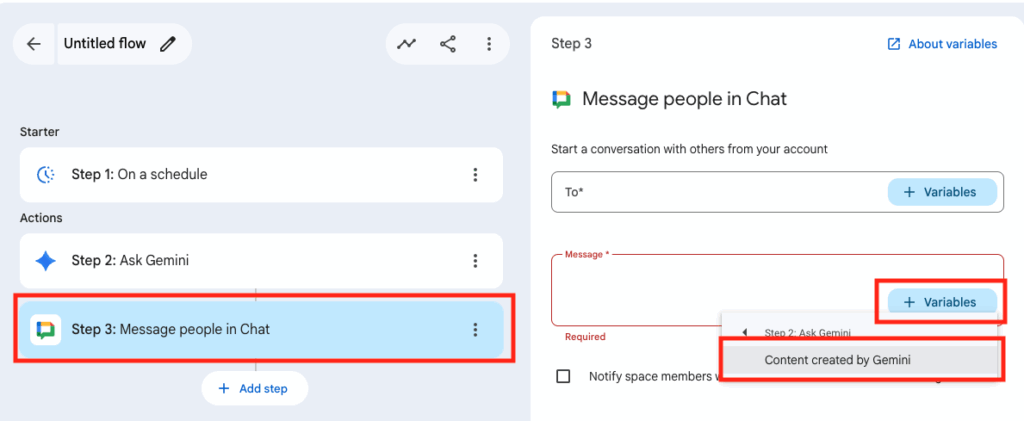 次にStep3のアクションとして「Message people in Chat」を指定します。その上で、詳細設定には「To」に自分の宛先、「Message」には、Step2の「Content created by Gemini」を指定します。