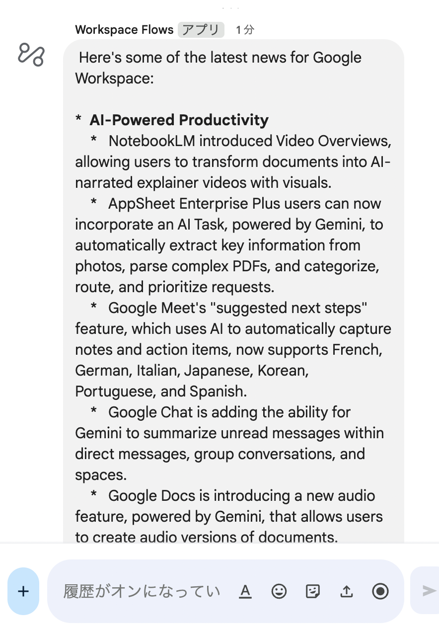 指定時間になると、Google Chatに対して、先程作成したフローからメッセージが送信されます。内容を見ると、Google Workspaceのアップデート情報になっており、指定した通りの内容が送信されたことが確認できます。