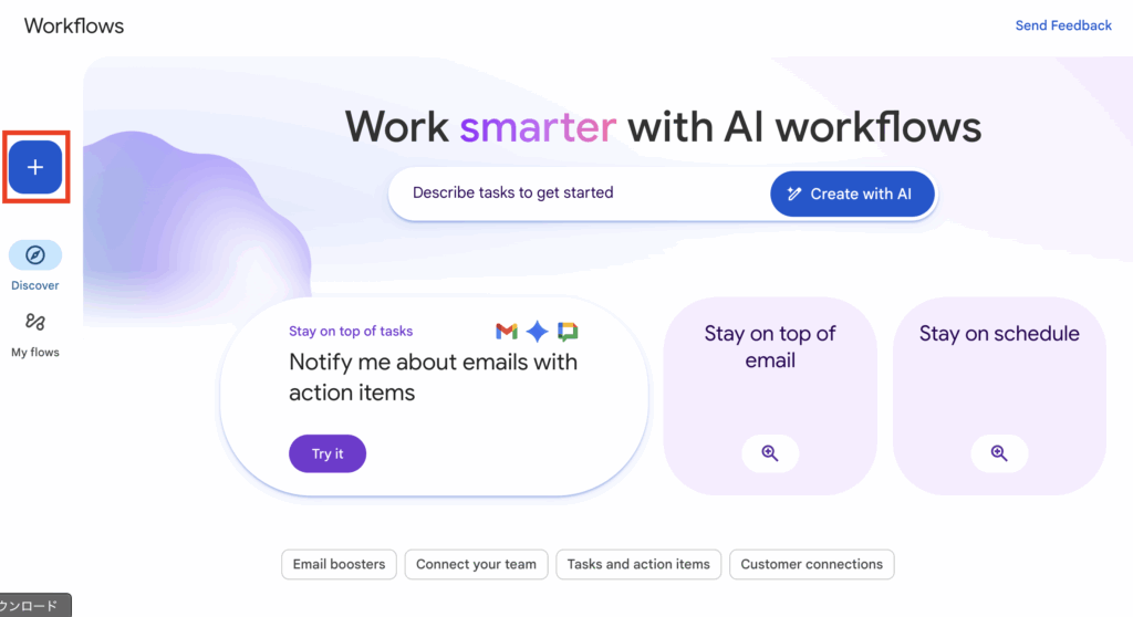 Workspace Flowsは現在アルファプログラムに申し込みしている企業にのみ展開されているため、利用するためには事前の申し込みが必要になります。詳しくはコチラのページをご確認ください。