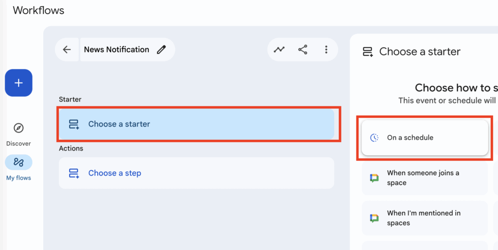 実行時間を設定するには、「Choose a starter」をクリックし、「On a schedule」を選択します。